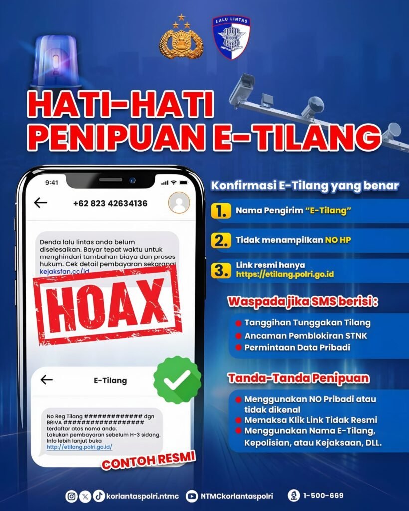 “Kami sarankan kepada masyarakat, jangan langsung melakukan transaksi. Kalau ada informasi tilang elektronik palsu atau informasi lain yang mengatasnamakan kepolisian, jangan langsung panik,” ujarnya, Sabtu (20/12/2025).